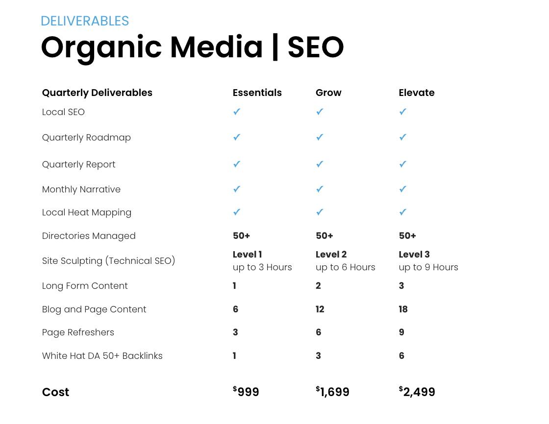SEO clients have the choice of running one of our pre-built packages or requesting a custom set of deliverables. For more information about SEO, visit the Organic Media and SEO sections of our Playbook, but here is a brief overview.